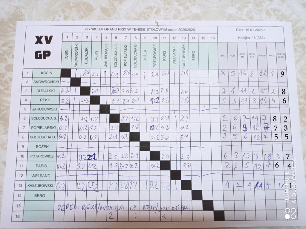 W czwartek 15 stycznia odbyła się 18 kolejka Grand Prix. W zawodach uczestniczyło dziewięciu zawodników. Pierwsze miejsce zajął kol. Maciek, przed Wiesławem, który przegrał tylko jeden mecz ze zwycięzcą kolejki.
