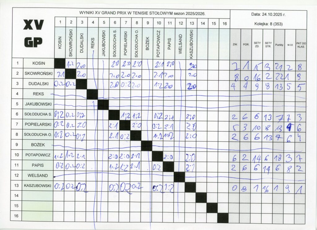 Szczególnie zacięta rywalizacja toczyła się o miejsce czwarte pomiędzy kolegami z drużyny- Wiesławem i Mariuszem. Obaj zdobyli identyczną ilość punktów (13), ale ostatecznie to Mariusz zajął wyższą pozycję, dzięki lepszemu bilansowi setów. Zresztą Mariusz wygrał też z kolegą Wiesławem bezpośredni pojedynek 2-0.