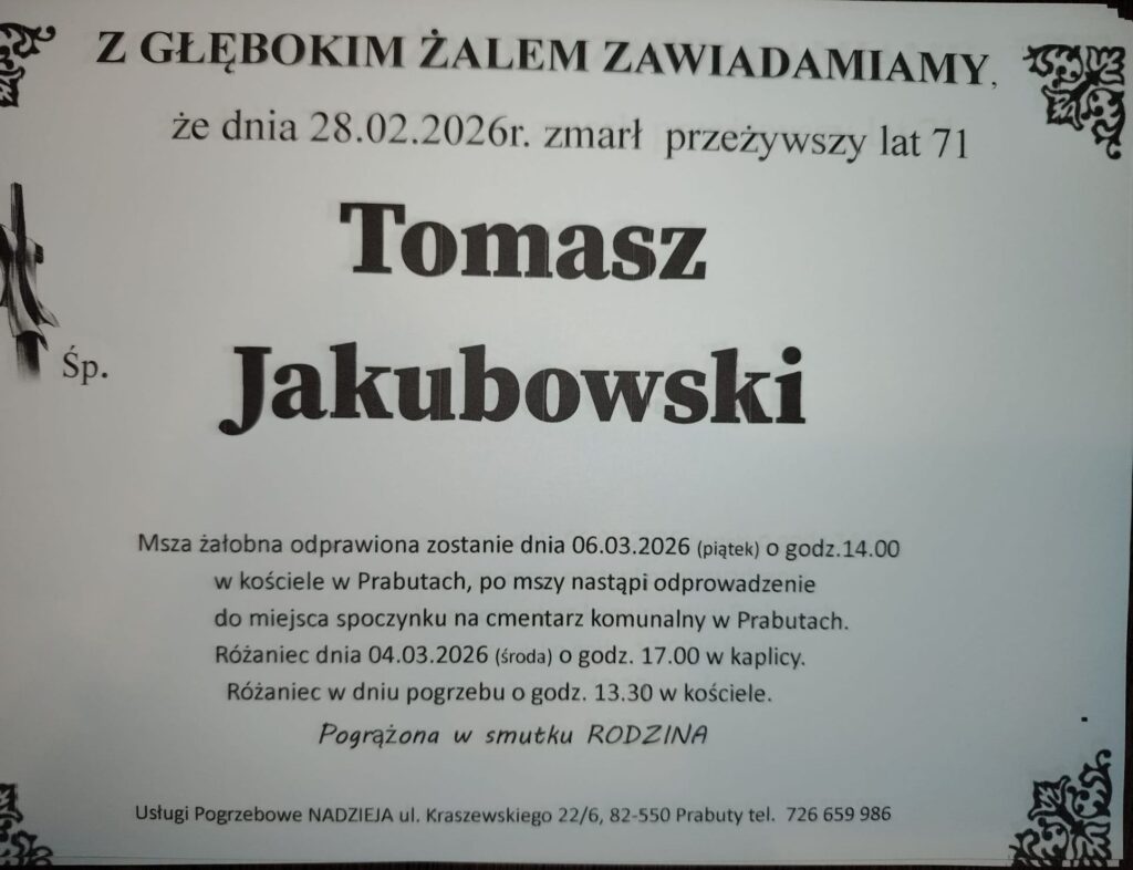 Z głębokim żalem żegnamy Tomasza Jakubowskiego naszego serdecznego kolegę i przyjaciela. Łączymy się w bólu z pogrążoną w żałobie Rodziną śp. Tomka. Msza żałobna zostanie odprawiona w piątek 6 marca o godz. 14.00 w kościele w Prabutach.